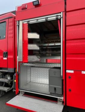 | 3.2 | 儲物箱:車輛設(shè)有(5個)防水、防塵的鋁合金卷簾門,卷簾門觸發(fā)電磁傳感器自動開關(guān)LED照明;在兩側(cè)卷簾門下方設(shè)有翻轉(zhuǎn)腳踏板,踏板行程由氣彈簧控制,踏板由整塊特制高強度鋁型材裁剪并與附件無焊接組裝而成、站立面防滑,每個踏板可稱重靜載荷200kg,便于取放儲物箱內(nèi)器材;儲物箱內(nèi)科學(xué)合理放置各類器材,固定牢靠、取放便捷。 |
